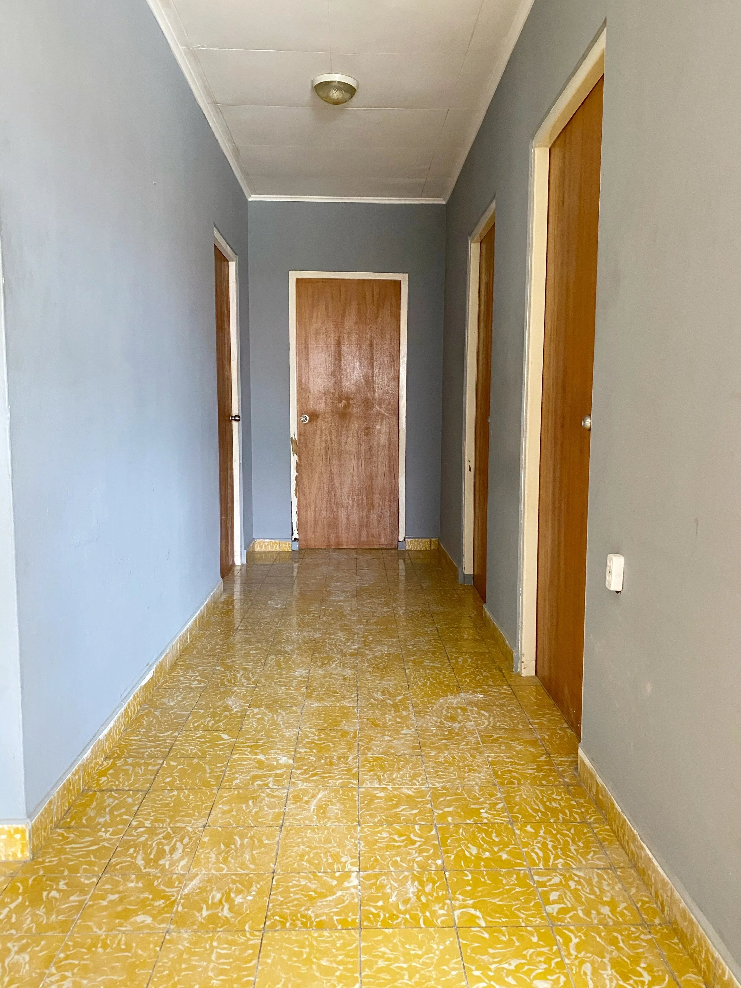 This house is 145m2 and has a big front- and back-porch. As you enter the house it has an open living and dining area. A big 2 sided door leading you to the back-porch. To your left the kitchen is located, which is also the part of the house that requires some maintenance. To your right the hallway is located with 2 bedrooms at your right, the master bedroom and its en-suite bathroom to your left and another bathroom at the end of the hallway.